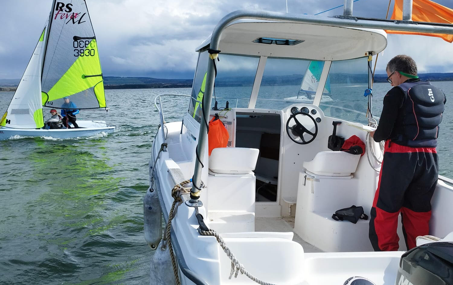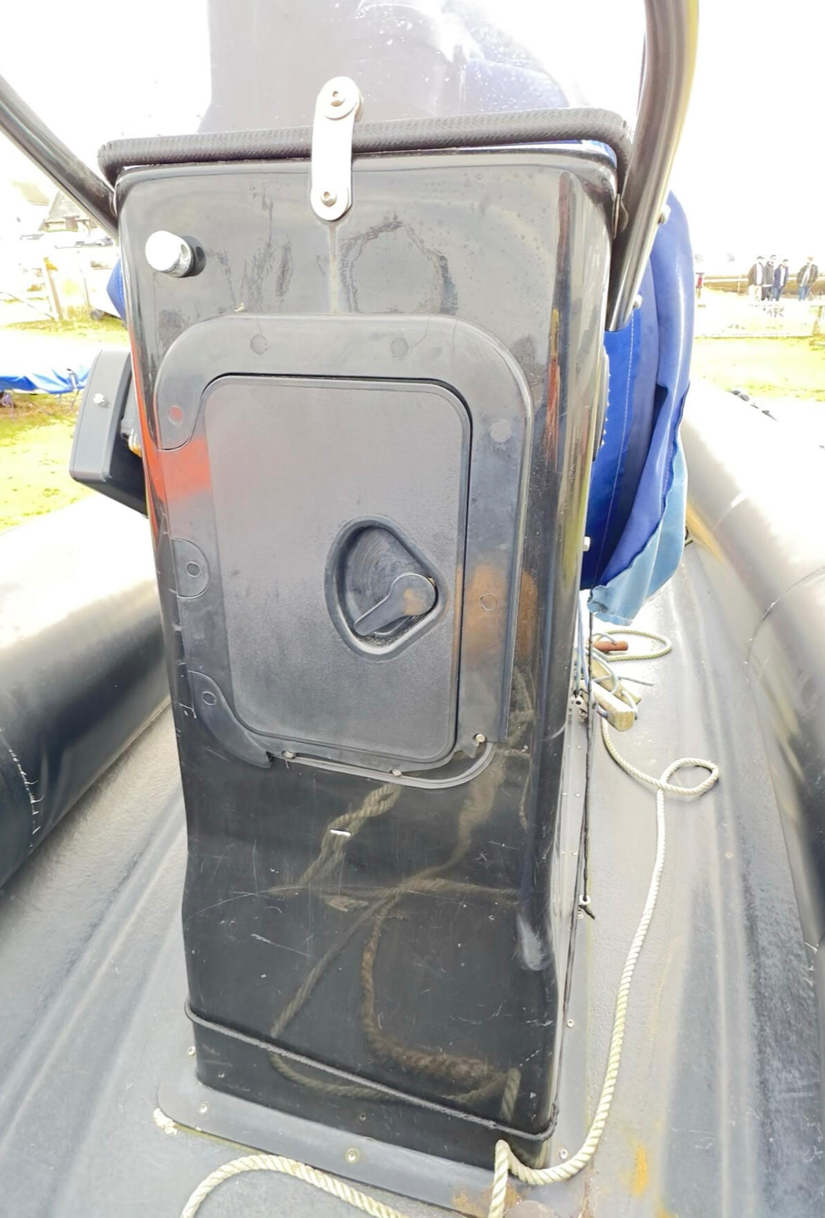The black Humber is the main safety boat for club racingIt has a has a battery isolator to prevent the battery running down, when the Humber is not in use.